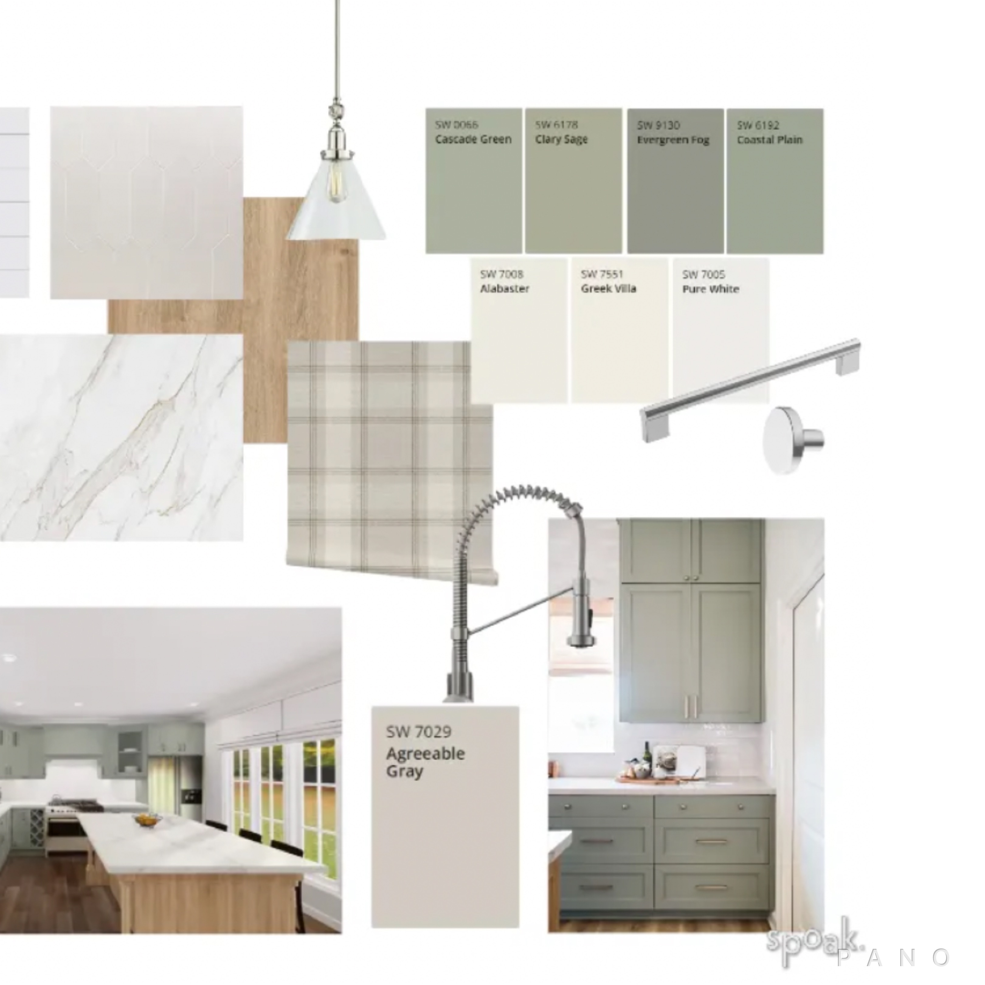 Our latest interior design mood board focuses on key kitchen trends for 2024. Imagine a room enveloped in organic shades of green, creating a tranquil and refreshing atmosphere. Light hardwood flooring brings warmth and a timeless appeal, grounding the space in natural beauty. The addition of sophisticated marble elements adds a touch of luxury, effortlessly blending modern chic with classic charm. This carefully curated combination not only enhances the visual appeal but also promotes a sense of balance and harmony within the room. It’s a perfect blend of nature-inspired tones and refined materials, creating a space that invites relaxation and sophistication. Let this mood board guide you towards a space that seamlessly combines beauty and functionality, transforming your home into a haven of style and comfort.